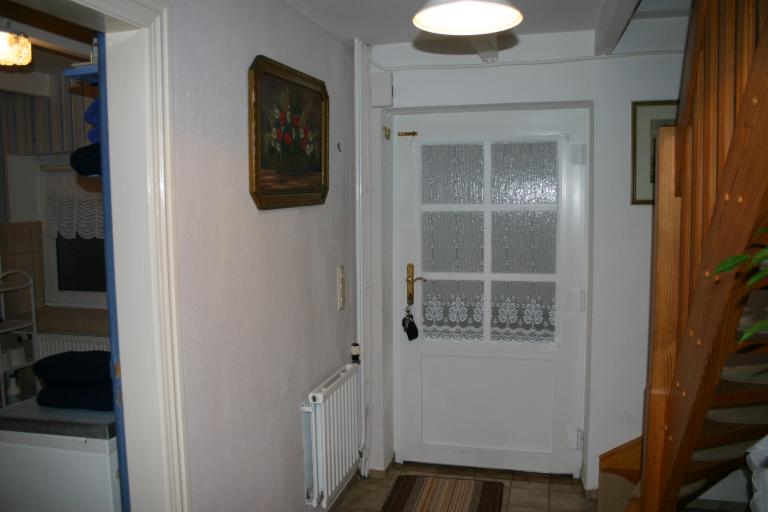 There is a staircase next to the entrance which leads to the top floor where the bedroom is situated. |