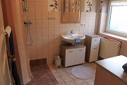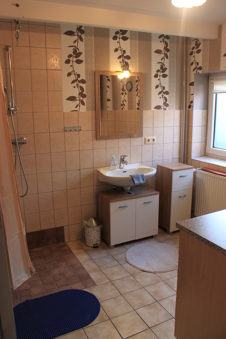 Das Bad ist mit einer bodengleichen Dusche ausgestattet und nur mit einem Vorhang abgeteilt, damit kein Duschbecken und keine Kabinentüren beim Duschen stören. Im Balken darüber befindet sich eine stabile Karabineraufhängung. |