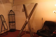 Ein sehr massives Kreuz aus Stahl sowie Stahlbock und -käfig, vom Möbeldesigner Heiße-Eisen, stehen im Spielzimmer zur Verfügung. Das Zimmer ist beheizt, auch Teppichboden ist vorhanden, im Sommer ist dieser Raum jedoch immer angenehm kühl. |